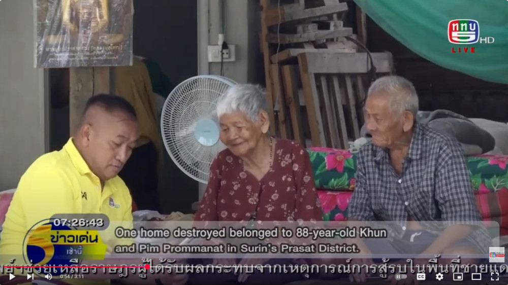 /หนึ่งในจํานวนนี้ คือบ้านของนายคูณ-นางปิม พรหมนัส (อ่านว่า พม-มะ-นัส) อายุ 88 ปี ชาวบ้านตาโสว์ หมู่ 10 ตําบลบ้านพลวง อําเภอปราสาท จังหวัดสุรินทร์ ซึ่งอาศัยอยู่กับลูก-หลาน กว่า 10 ชีวิต ถูกกระสุนอาวุธยิงระเบิด แบบ BM 21 ตกใส่เมื่อเช้าวันที่ 27 กรกฎาคม 2568 ที่ผ่านมา ก่อนเกิดไฟลุกไหม้เสียหายทั้งหลัง ล่าสุด /ครอบครัวของนายคูณ-นางปิม ได้มาอาศัยอยู่ที่พักของเพื่อนบ้านเป็นการชั่วคราว