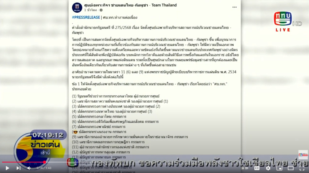 คําสั่งสํานักนายกรัฐมนตรี ที่ 275/2568 เรื่องจัดตั้งศูนย์เฉพาะกิจบริหารสถานการณ์บริเวณชายแดนไทย - กัมพูชา โดยที่เป็นการสมควรจัดตั้งศูนย์เฉพาะกิจบริหารสถานการณ์บริเวณชายแดนไทย - กัมพูชา ขึ้น เพื่อบูรณาการการปฏิบัติของทุกหน่วยงานที่เกี่ยวข้องกับสถานการณ์ให้มีความเป็นเอกภาพ โดยมุ่งหมายที่จะแก้ไขความตึงเครียดและความขัดแย้งที่เกิดขึ้นตามแนวชายแดนอย่างมิตรประเทศ โดยมี พลเอกณัฐพล นาคพานิชย์ รัฐมนตรีช่วยว่าการกระทรวงกลาโหม เป็นผู้อํานวยการศูนย์ และให้ ศบ.ทก. มีหน้าที่และอํานาจ ติดตาม ตรวจสอบ วิเคราะห์ กลั่นกรอง และประเมินสถานการณ์ ให้ความเห็นและข้อเสนอแนะเกี่ยวกับมาตรการที่จําเป็น แต่งตั้งคณะอนุกรรมการ คณะทํางาน หรือมอบหมายเจ้าหน้าที่ที่เกี่ยวข้อง เพื่อสนับสนุนการปฏิบัติหน้าที่ได้ตามความจําเป็นและเหมาะสม รายงานผลการปฏิบัติงานและการบริหารสถานการณ์ชายแดน และเมื่อสถานการณ์เข้าสู่ภาวะปกติ