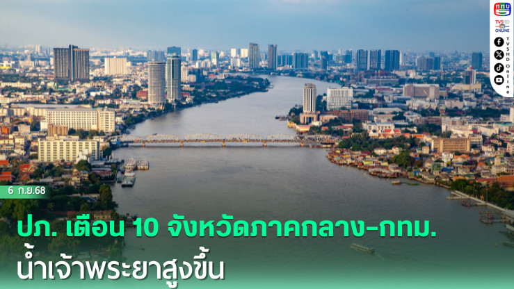 วันที่ 6 กันยายน 2568 - กรมป้องกันและบรรเทาสาธารณภัย (ปภ.) ประสานกับ 10 จังหวัดภาคกลาง ได้แก่ อุทัยธานี ชัยนาท สิงห์บุรี อ่างทอง สุพรรณบุรี พระนครศรีอยุธยา ลพบุรี ปทุมธานี นนทบุรี สมุทรปราการ และกรุงเทพมหานคร เพื่อเฝ้าระวังระดับน้ําในแม่น้ําเจ้าพระยาที่มีแนวโน้มเพิ่มสูงขึ้นตั้งแต่วันที่ 5 กันยายนเป็นต้นมา