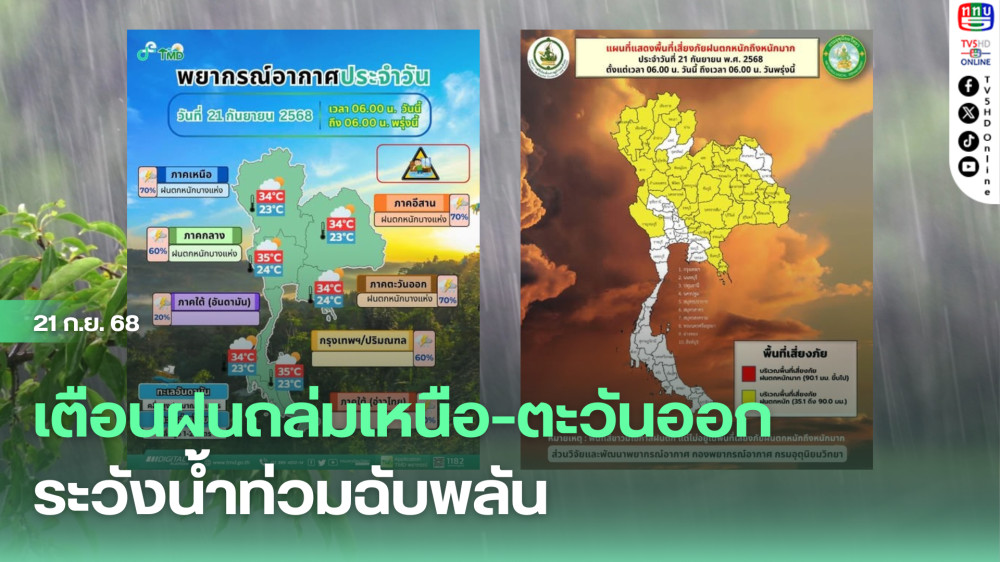 วันที่ 21 กันยายน 2568 - กรมอุตุนิยมวิทยาออกประกาศพยากรณ์อากาศ 24 ชั่วโมงข้างหน้า ระบุว่า ประเทศไทยตอนบนยังคงมีฝนตกหนักบางแห่ง โดยเฉพาะในจังหวัด แม่ฮ่องสอน ตาก จันทบุรี และตราด ขอให้ประชาชนในพื้นที่ดังกล่าวเฝ้าระวังอันตรายจากฝนตกหนักและฝนที่ตกสะสม ซึ่งอาจก่อให้เกิดน้ําท่วมฉับพลันและน้ําป่าไหลหลากได้