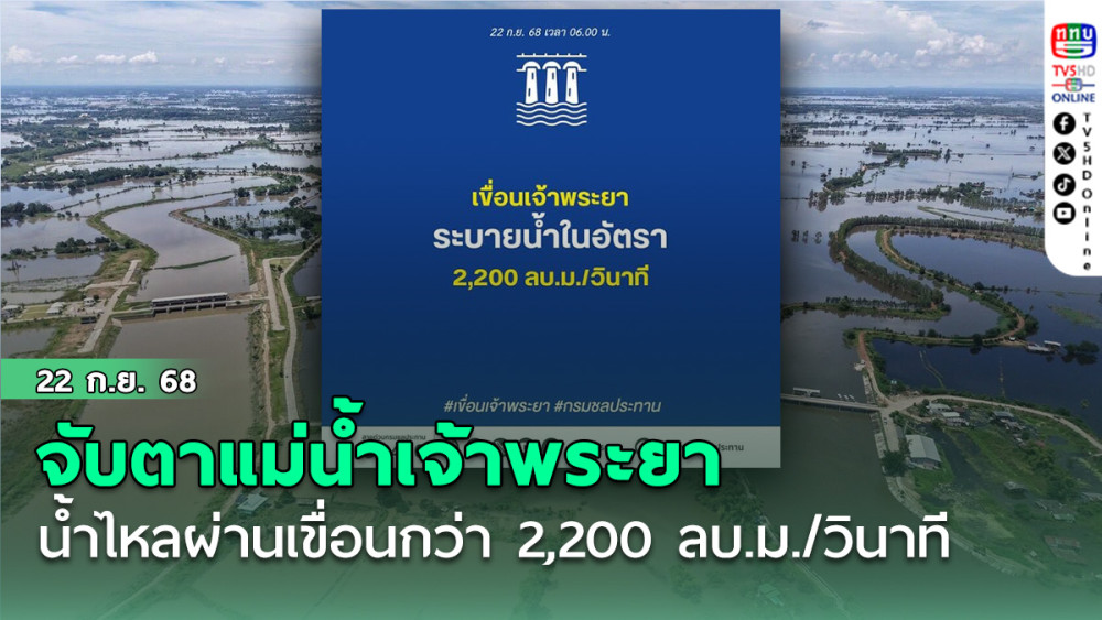 สถานการณ์น้ําเจ้าพระยา 22 ก.ย. 68 น้ําไหลผ่านเขื่อนเจ้าพระยากว่า 2,200 ลบ.ม./วินาที กรมชลฯ หน่วงน้ําเหนือเขื่อนลดผลกระทบพื้นที่ท้ายเขื่อน
