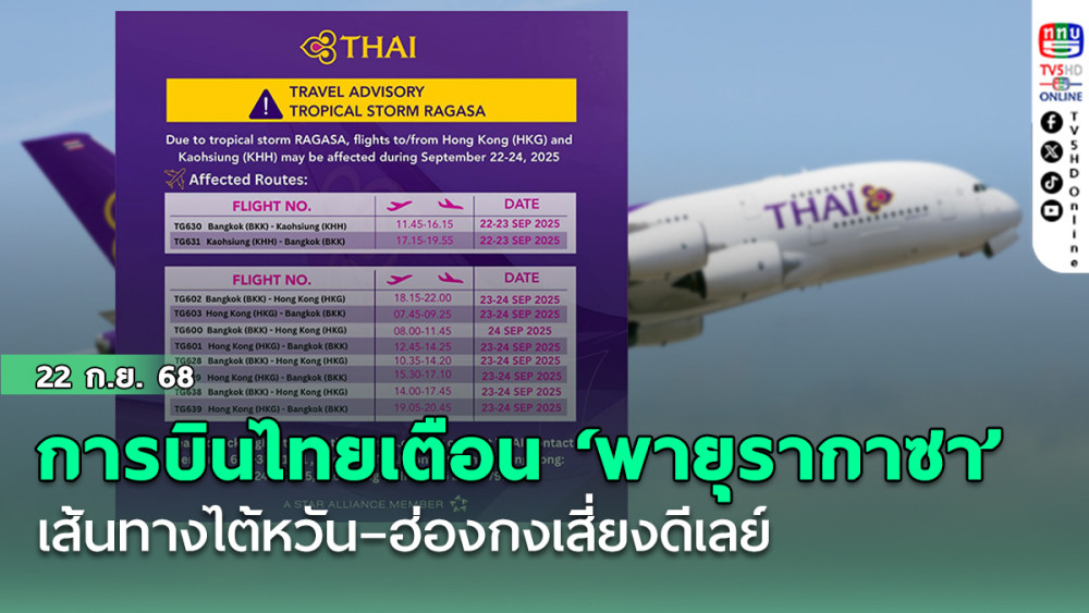 การบินไทยแจ้งผลกระทบจากพายุไต้ฝุ่น “รากาซา” 22–24 ก.ย. เที่ยวบินเส้นทางฮ่องกง–ไต้หวันอาจล่าช้า–ยกเลิก