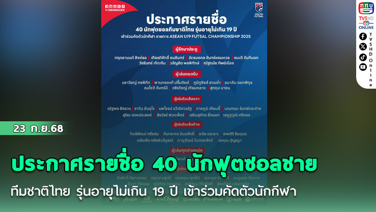 สมาคมกีฬาฟุตบอลแห่งประเทศไทย ในพระบรมราชูปถัมภ์ ประกาศรายชื่อ 40 นักฟุตซอลชายทีมชาติไทย รุ่นอายุไม่เกิน 19 ปี เข้าร่วมคัดตัวนักกีฬา รายการ ASEAN U19 FUTSAL CHAMPIONSHIP 2025 ระหว่างวันที่ 22-28 ธันวาคม 2568 ที่อาคารโรงยิมเนเซียม อบจ.นนทบุรี