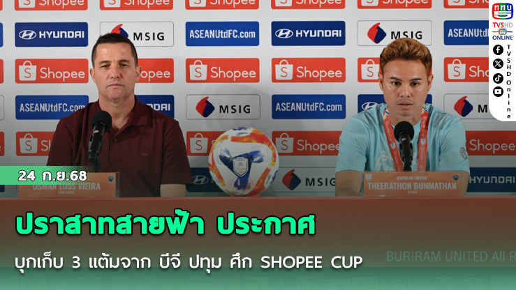 ความเคลื่อนไหวการแข่งขันฟุตบอลชิงแชมป์สโมสรอาเซียน รายการ “SHOPEE CUP 2025/26” กลุ่มเอ นัดที่ 2 “ปราสาทสายฟ้า” บุรีรัมย์ ยูไนเต็ด แชมป์เก่า มีคิวบุกไปเยือน ทําศึกสายเลือดกับเพื่อนร่วมไทยลีก อย่าง “เดอะ แรบบิท” บีจี ปทุม ยูไนเต็ด ที่สนามปทุมธานี สเตเดียม ซึ่งจะฟาดแข้งกันในวันพุธที่ 24 กันยายน 2568 คิกออฟเวลา 19.00 น. ถ่ายทอดสดผ่านฟรีทีวี ทางไทยรัฐ ทีวี (ช่อง 32), AIS PLAY และYouTube : BG Sports