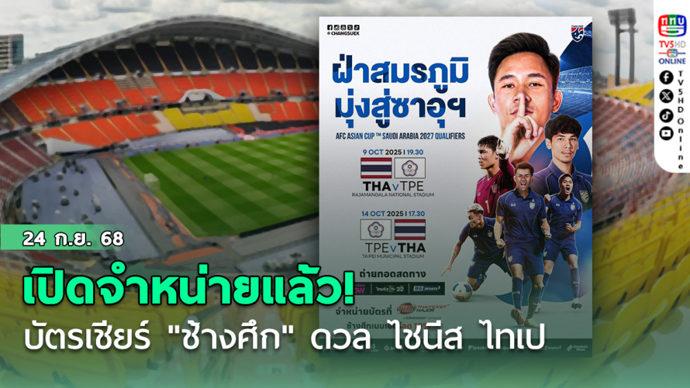 ไทย ทิคเกต เมเจอร์ เปิดขายบัตร เกม "ทีมชาติไทย" ลงทําการแข่งขันฟุตบอล เอเชียน คัพ 2027 รอบคัดเลือก (AFC Asian Cup Saudi Arabia 2027 Qualifiers) พบกับ ไชนีส ไทเป ทีมอันดับ 173 ของโลก ณ สนามราชมังคลากีฬาสถาน ในวันที่ 9 ตุลาคม 2568 เวลา 19.30 น.