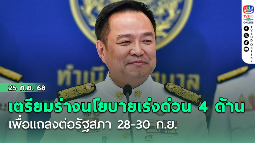 วานนี้ (24 กันยายน 2568) เวลา 22.00 น. ณ ตึกภักดีบดินทร์ ทําเนียบรัฐบาล นายอนุทิน ชาญวีรกูล นายกรัฐมนตรีและรัฐมนตรีว่าการกระทรวงมหาดไทย กล่าวภายหลังการประชุมคณะรัฐมนตรี (นัดพิเศษ) ว่า ที่ประชุมคณะรัฐมนตรีเห็นชอบร่างนโยบายรัฐบาลที่จะนําไปแถลงต่อรัฐสภา เพื่อกําหนดทิศทางการบริหารประเทศไทยในระยะเวลาอันจํากัด ซึ่งเน้นการแก้ไขปัญหา 4 ด้าน ได้แก่
