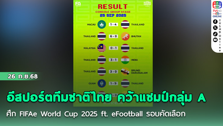อีสปอร์ตทีมชาติไทย ประเภท Console ที่ประกอบไปด้วย พงศ์วิทย์ แต้วัฒนาสกุล aka : Bössui} สิรวุฒิ รุ่งรัตน์กสิกุล aka : Jeansui, ปฏิวัติ อเดโช aka : ADECHO, จิรายุ แต้วัฒนาสกุล aka : FRONKX และ บดินทร์ รุ่งรัตน์กสิกุล aka : YoWingZab - นักกีฬาประเภท Console คว้าแชมป์กลุ่ม เอ ของการแข่งขัน FIFAe World Cup 2025 ft. eFootball รอบคัดเลือก Regional Online Qualifier ประเภท Console มาครองได้สําเร็จ