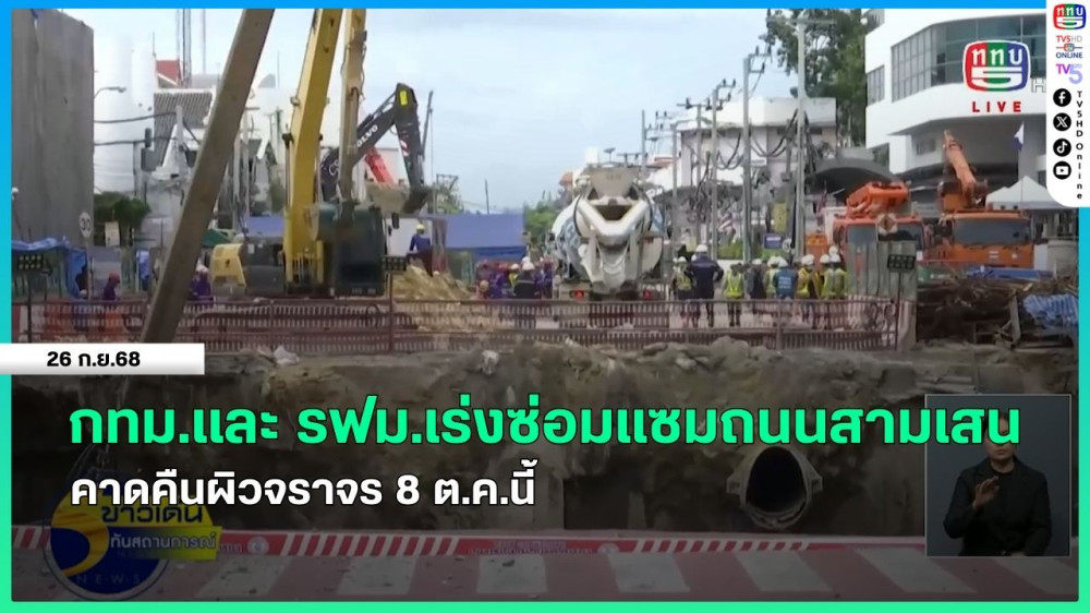 กทม.และ รฟม.เร่งซ่อมแซมถนนสามเสน คาดคืนผิวจราจร 8 ต.ค.นี้ + ตํารวจแบ่งทําคดีถนนทรุดเป็น 2 ส่วน ส่วนบุคคลและทรัพย์สินราชการ