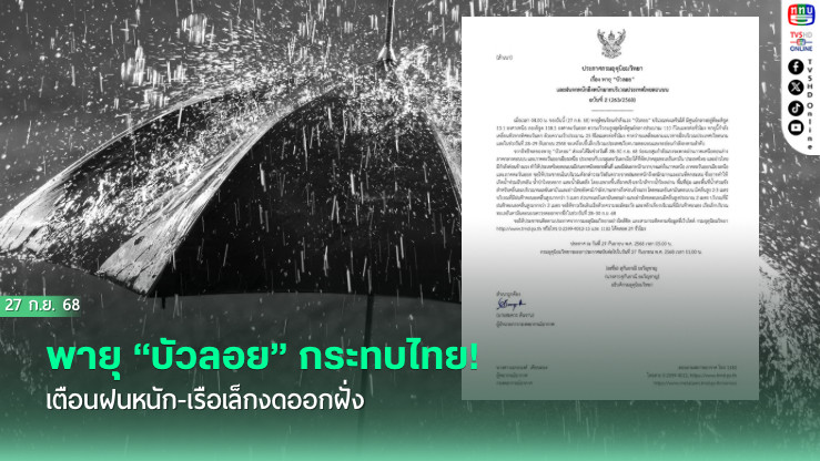 กรมอุตุฯ เตือนฝนตกหนักทั่วไทยตอนบน เสี่ยงน้ําท่วมฉับพลัน–น้ําป่าไหลหลาก คลื่นลมแรงสูงกว่า 3 เมตร พายุ “บัวลอย” จ่อขึ้นฝั่งเวียดนาม