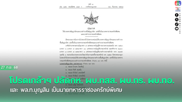 เว็บไซต์ราชกิจจานุเบกษา เผยแพร่ประกาศให้นายทหารสัญญาบัตรและนายตํารวจชั้นสัญญาบัตร แต่งตั้งเป็นนายทหารราชองครักษ์พิเศษและนายตํารวจราชองครักษ์พิเศษ มีพระบรมราชโองการโปรดเกล้าโปรดกระหม่อมให้นายทหารสัญญาบัตรและนายตํารวจชั้นสัญญาบัตร แต่งตั้งเป็นนายทหารราชองครักษ์พิเศษและนาย ตํารวจราชองครักษ์พิเศษ อาศัยอํานาจตามความในมาตรา ๗ แห่งพระราชบัญญัติการถวายความปลอดภัย พ.ศ. 2560 มาตรา 6 มาตรา 7 และมาตรา 10 แห่งพระราชบัญญัติราชองครักษ์ พุทธศักราช 2480 มาตรา 4 มาตรา 5 และมาตรา 6 แห่งพระราชบัญญัตินายตํารวจราชสํานัก พ.ศ. 2495 และข้อ 6 ของระเบียบกระทรวงกลาโหมว่าด้วยการแต่งตั้งราชองครักษ์ พ.ศ.2559