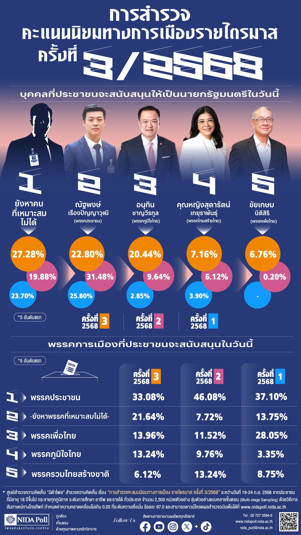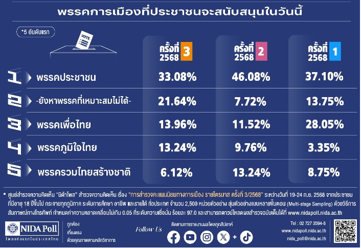 นิด้าโพลเผยผลสํารวจคะแนนนิยมไตรมาส 3/68 ประชาชน 27.28% ยังไม่เจอแคนดิเดตนายกฯ ที่เหมาะสม ขณะที่ “พรรคประชาชน” ครองแชมป์พรรคการเมืองยอดนิยม 33.08%