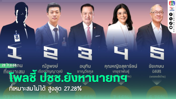 ผลการสํารวจในประเด็นบุคคลที่ประชาชนสนับสนุนให้เป็นนายกรัฐมนตรีในวันนี้ พบว่า ร้อยละ 27.28 ระบุว่ายังไม่พบผู้ที่เหมาะสม ขณะที่อันดับ 2 ได้แก่ นายณัฐพงษ์ เรืองปัญญาวุฒิ จากพรรคประชาชน ได้ร้อยละ 22.80 ตามมาด้วยนายอนุทิน ชาญวีรกูล พรรคภูมิใจไทย ร้อยละ 20.44 อันดับถัดมาคือคุณหญิงสุดารัตน์ เกยุราพันธุ์ พรรคไทยสร้างไทย ร้อยละ 7.16 และนายชัยเกษม นิติสิริ พรรคเพื่อไทย ร้อยละ 6.76 ส่วนอดีตนายกรัฐมนตรี พลเอกประยุทธ์ จันทร์โอชา อยู่ในอันดับ 6 ด้วยคะแนนร้อยละ 6.00