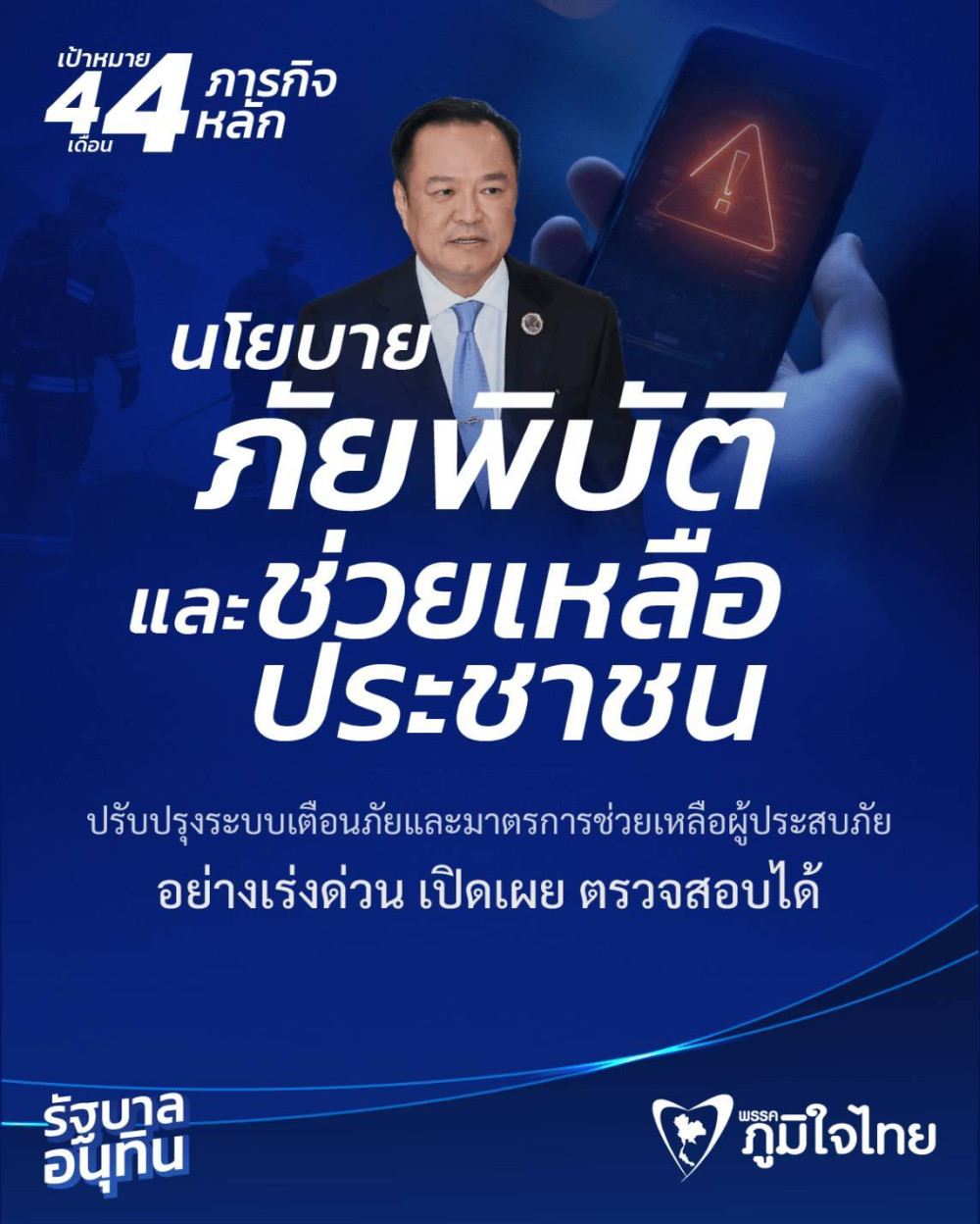 พรรคภูมิใจไทยปล่อยภาพสรุปนโยบายผ่านเพจพรรค เน้น 4 เดือนแรกเดินหน้า 4 ภารกิจหลัก ลดค่าครองชีพ–ปกป้องอธิปไตย–รับมือภัยพิบัติ–ปราบอาชญากรรมสังคม หวังเรียกคืนความเชื่อมั่นประเทศ