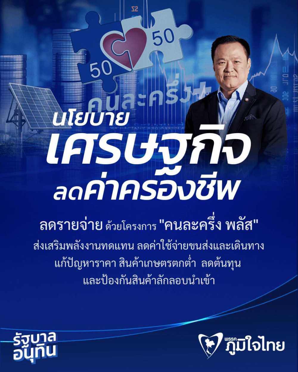 1. เศรษฐกิจ – ลดค่าครองชีพด้วยโครงการ “คนละครึ่งพลัส” ส่งเสริมพลังงานทดแทน ลดค่าใช้จ่ายด้านการขนส่งและการเดินทาง พร้อมทั้งแก้ปัญหาสินค้าเกษตรราคาตกต่ํา ด้วยมาตรการลดต้นทุนและสกัดการลักลอบนําเข้าสินค้า