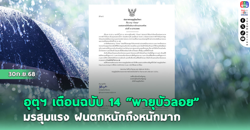 กรมอุตุฯ ประกาศฉบับที่ 14 เตือน พายุบัวลอย ฝนตกหนักถึงหนักมาก มรสุมกําลังแรง ขอให้ประชาชนระวังอันตรายจากน้ําท่วมฉับพลันและ น้ําป่าไหลหลาก