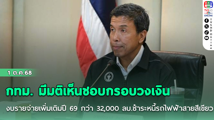กทม. มีมติเห็นชอบกรอบวงเงินงบรายจ่ายเพิ่มเติมปี 69 กว่า 32,000 ล้านบาท ชําระหนี้รถไฟฟ้าสายสีเขียว ย้ําเร่งดําเนินการเพื่อลดภาระดอกเบี้ย