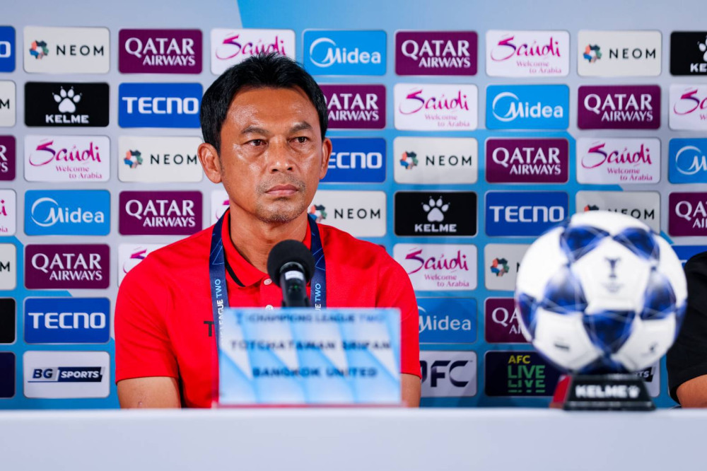 ณ ห้องแถลงข่าวสนาม ทรู บีจี สเตเดี้ยม “โค้ชแบน” ธชตวัน ศรีปาน และ ปราตามา อาร์ฮาน ในฐานะตัวแทนของสโมสรทรู แบงค็อก ยูไนเต็ด เข้าร่วมแถลงข่าวก่อนเกมการแข่งขัน ฟุตบอล เอเอฟซี แชมเปียนส์ ลีก ทู 2025/26 รอบแบ่งกลุ่ม กลุ่มจี นัดที่สอง เปิด ทรู บีจี สเตเดี้ยม พบ เปอร์ซิบ บันดุง ในวันนี้