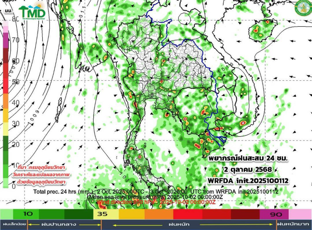 02 ตุลาคม 2568 กรมอุตุนิยมวิทยา พยากรณ์อากาศ 24 ชั่วโมงข้างหน้า ประเทศไทยเริ่มมีฝนลดลง แต่ยังคงมีฝนตกหนักบางแห่งบริเวณด้านตะวันตกของภาคเหนือและภาคกลาง โดยเฉพาะบริเวณจังหวัดแม่ฮ่องสอน เชียงใหม่ เชียงราย และตาก ขอให้ประชาชนในบริเวณดังกล่าวระวังอันตรายจากฝนตกหนักและฝนที่ตกสะสม ซึ่งอาจทําให้เกิดน้ําท่วมฉับพลัน น้ําป่าไหลหลาก และน้ําล้นตลิ่ง โดยเฉพาะพื้นที่ลาดเชิงเขาใกล้ทางน้ําไหลผ่าน และพื้นที่ลุ่ม เนื่องจากมีลมตะวันออกพัดปกคลุมภาคตะวันออกเฉียงเหนือ ภาคตะวันออก และอ่าวไทย ในขณะที่มรสุมตะวันตกเฉียงใต้ที่พัดปกคลุมทะเลอันดามัน ประเทศไทย และอ่าวไทยมีกําลังอ่อน
