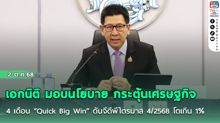 เอกนิติ มอบนโยบาย กระตุ้นเศรษฐกิจ 4 เดือน “Quick Big Win” ดันจีดีพีไตรมาส 4/2568 โตเกิน 1% ผลักดันเศรษฐกิจไทยพ้นจากหล่ม-ไม่ตกลงเหว