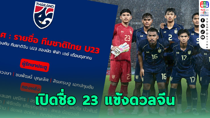 สมาคมกีฬาฟุตบอลแห่งประเทศไทย ในพระบรมราชูปถัมภ์ ประกาศรายชื่อ 23 นักฟุตบอลชายทีมชาติไทย รุ่นอายุไม่เกิน 23 ปี เตรียมความพร้อมสําหรับการแข่งขันฟุตบอลอุ่นเครื่องนัดพิเศษ ที่จะพบกับ ทีมชาติจีน U23 ในช่วงฟีฟ่า เดย์ ระหว่างวันที่ 6-15 ตุลาคม 2568 ภายใต้การคุมทัพของ "โค้ชวัง" ธวัชชัย ดํารงอ่องตระกูล หัวหน้าผู้ฝึกสอน