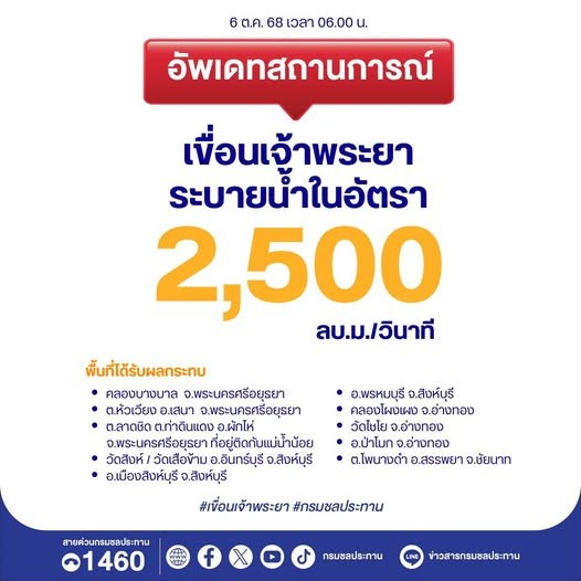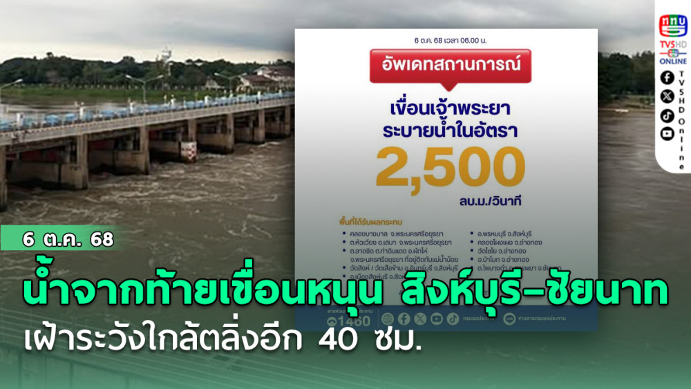 6 ต.ค. 2568 สถานการณ์ลุ่มน้ําเจ้าพระยายังสูงต่อเนื่อง เขื่อนเจ้าพระยาระบาย 2,500 ลบ.ม./วินาที (วันที่ 4) หลังคันดินวัดสมอพัง น้ําทะลักท่วม ต.โพนางดําออก ชัยนาท อพยพกว่า 400 ครัวเรือนไปตั้งเพิงพักริมคันคลองมหาราช