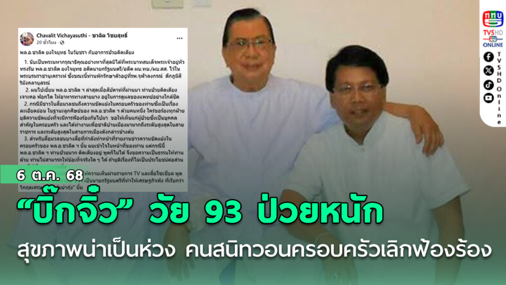 เมื่อวันที่ 6 ตุลาคม 2568 นายชวลิต วิชยสุทธิ์ รองหัวหน้าพรรคไทยสร้างไทย และอดีต ส.ส.นครพนม ซึ่งเป็นคนใกล้ชิดของ พล.อ.ชวลิต ยงใจยุทธ หรือ “บิ๊กจิ๋ว” อดีตนายกรัฐมนตรี โพสต์ข้อความผ่านเฟซบุ๊กเผยอาการป่วยของ พล.อ.ชวลิต ในวัย 93 ปี ขณะนี้ป่วยติดเตียง เจาะคอ ฟอกไต และให้อาหารทางสายยาง ภายใต้การดูแลของแพทย์ รพ.จุฬาลงกรณ์ อย่างใกล้ชิด โดยอยู่ในพระบรมราชานุเคราะห์