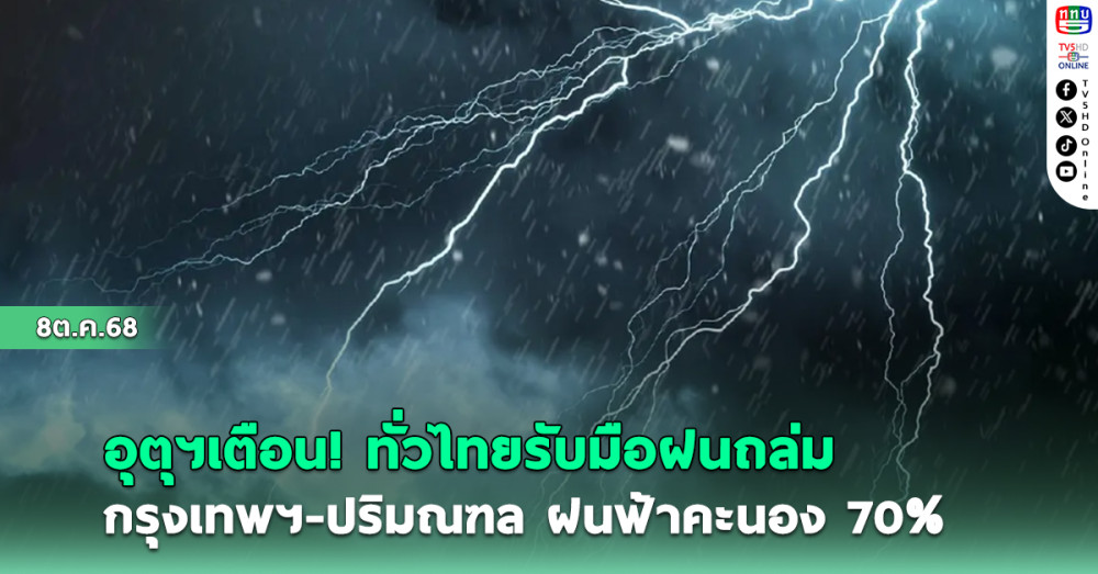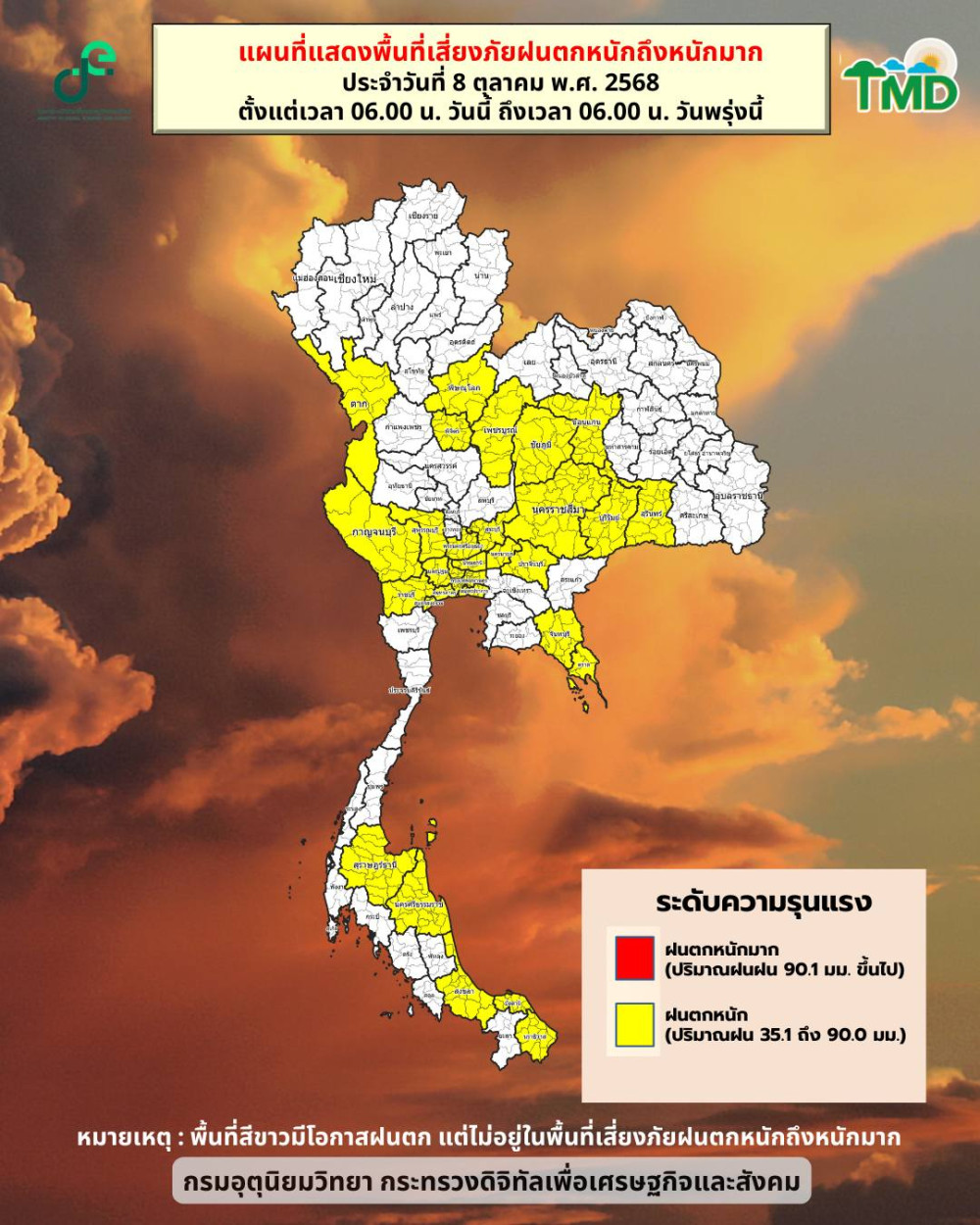 วันนี้ (8 ต.ค.2568) กรมอุตุนิยมวิทยา พยากรณ์อากาศ 24 ชั่วโมงข้างหน้า ประเทศไทยมีฝนเพิ่มขึ้นและมีฝนตกหนักบางแห่ง ขอให้ประชาชนระวังอันตรายจากฝนตกหนักไว้ด้วย ทั้งนี้เนื่องจากร่องมรสุมพาดผ่านภาคเหนือ ภาคกลาง และภาคตะวันออก ในขณะที่มรสุมตะวันตกเฉียงใต้พัดปกคลุมทะเลอันดามัน ภาคใต้ และอ่าวไทย