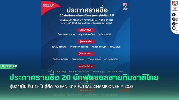 สมาคมกีฬาฟุตบอลแห่งประเทศไทย ในพระบรมราชูปถัมภ์ ประกาศรายชื่อ 20 นักฟุตซอลชายทีมชาติไทย รุ่นอายุไม่เกิน 19 ปี ที่ผ่านการคัดตัวนักกีฬา เพื่อเตรียมทําการแข่งขันรายการ ASEAN U19 FUTSAL CHAMPIONSHIP 2025 ระหว่างวันที่ 22-28 ธันวาคม 2568 ณ ยิมเนเซียม อบจ.นนทบุรี