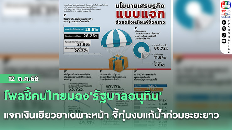 12 ตุลาคม 2568 “สวนดุสิตโพล” มหาวิทยาลัยสวนดุสิต สํารวจความคิดเห็นประชาชนทั่วประเทศ เรื่อง “นโยบายเศรษฐกิจแบบแจกช่วยจริงหรือแค่ชั่วคราว”กลุ่มตัวอย่าง จํานวน 1,203 คน (สํารวจทางออนไลน์และภาคสนาม) ระหว่างวันที่ 7-10 ตุลาคม2568 พบว่า กลุ่มตัวอย่างมองว่านโยบายเศรษฐกิจของรัฐบาลอนุทินเป็นแบบเน้นแจกเงินหรือช่วยเฉพาะหน้า ร้อยละ 29.51