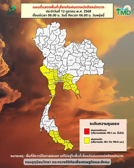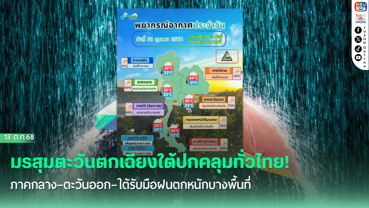 วันที่ 13 ตุลาคม 2568 - พยากรณ์อากาศ 24 ชั่วโมงข้างหน้า ภาคกลางตอนล่าง รวมทั้งกรุงเทพมหานครและปริมณฑล ภาคตะวันออก และภาคใต้มีฝนตกหนักบางพื้นที่ เนื่องจากร่องมรสุมพาดผ่านภาคกลางตอนล่าง ภาคตะวันออก และภาคใต้ตอนบน ประกอบกับมรสุมตะวันตกเฉียงใต้ยังคงพัดปกคลุมทะเลอันดามัน ภาคใต้ตอนล่าง และอ่าวไทย ขอให้ประชาชนในบริเวณดังกล่าวระวังอันตรายจากฝนตกหนักไว้้ด้วย