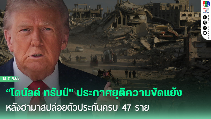 “โดนัลด์ ทรัมป์” ประกาศยุติความขัดแย้ง หลังฮามาสปล่อยตัวประกันครบ 47 ราย เตรียมขึ้นกล่าวสุนทรพจน์ที่รัฐสภาอิสราเอล ก่อนเข้าร่วมประชุมสันติภาพโลกที่อียิปต์
