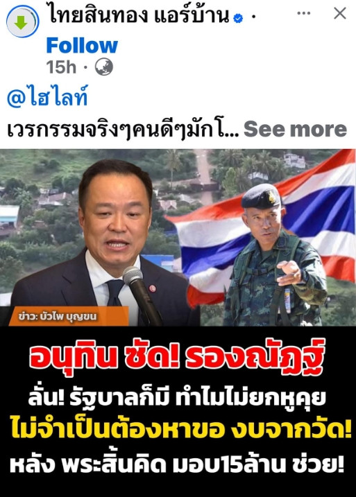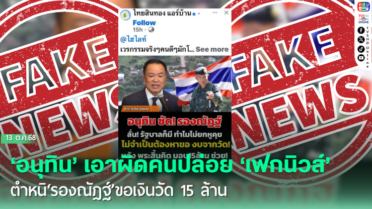 13 ตุลาคม 2568 จากกรณีโซเชียลมีการแชร์ข่าวปลอม ว่า นายอนุทิน ชาญวีรกูล นายกรัฐมนตรีปละรมว.มหาดไทย ตําหนิ พล.ต.ณัฏฐ์ ศรีอินทร์ รองแม่ทัพภาคที่ 2 ขอเงินบริจาคจากวัด 15 ล้านบาทนั้น