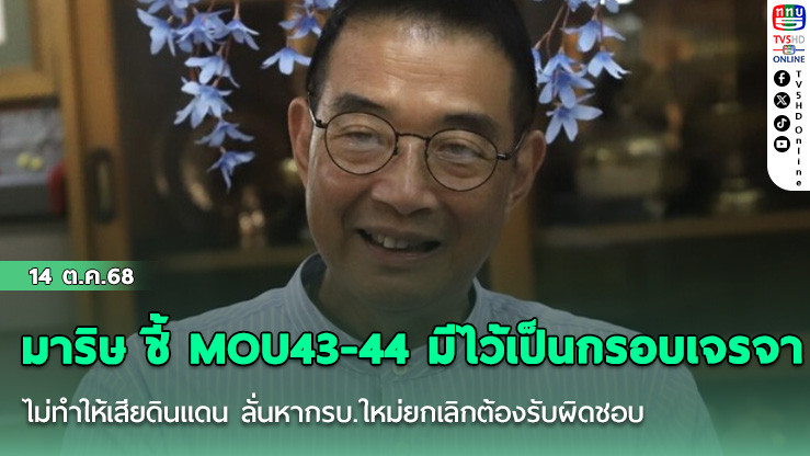 มาริษ ชี้ MOU43-44 มีไว้เป็นกรอบเจรจา ไม่ทําให้เสียดินแดน ลั่นหากรบ.ใหม่ยกเลิกต้องรับผิดชอบ สีหศักดิ์ ถกเขมรลดตึงเครียดชายแดน มาเลย์-มะกัน ร่วม ย้ํายึด4ข้อ