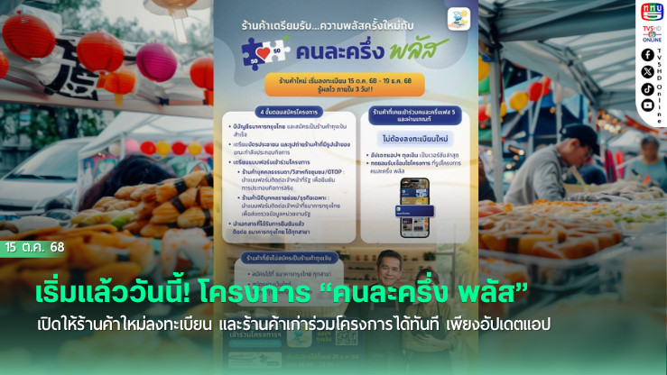 กระทรวงการคลังเปิดโครงการ “คนละครึ่ง พลัส” อย่างเป็นทางการ วันที่ 15 ตุลาคม 2568 เปิดโอกาสให้ร้านค้าทั่วประเทศเข้าร่วมโครงการ เพื่อเพิ่มรายได้และกระตุ้นเศรษฐกิจฐานราก โดยร้านค้าเดิมไม่ต้องลงทะเบียนใหม่ เพียงอัปเดตแอป “ถุงเงิน” และกดรับสิทธิ ก็สามารถเข้าร่วมได้ทันที โดยโครงการ “คนละครึ่ง พลัส” เปิดให้ ร้านค้ารายใหม่ ลงทะเบียนเข้าร่วมโครงการตั้งแต่วันนี้เป็นต้นไป