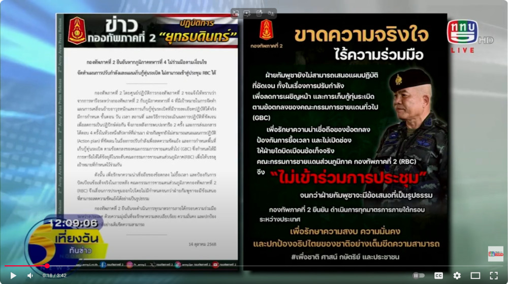 นย์ปฏิบัติการกองทัพภาคที่ 2 ออกแถลงการณ์ชี้แจงการหารือระหว่างกองทัพภาคที่ 2 กับภูมิภาคทหารที่ 4 ที่มีเป้าหมายในการจัดทําแผนการเคลื่อนย้ายอาวุธหนักและการเก็บกู้วัตถุระเบิดที่มีรายละเอียดปฏิบัติได้จริง มีกําหนดการ ขั้นตอน วัน เวลา สถานที่ และวิธีการประเมินผลการปฏิบัติที่ชัดเจน เพื่อลดการเป็นปฏิปักษ์ต่อกัน ซึ่งภายหลังการพบหารือ 2 ครั้ง และการส่งเอกสารโต้ตอบ 4 ครั้งในห้วง 1 สัปดาห์ที่ผ่านมา ฝ่ายกัมพูชายังไม่สามารถเสนอแผนการปฏิบัติที่ชัดเจน คณะกรรมการ RBC กองทัพภาคที่ 2 จึงเลื่อนการปรระชุมออกไปโดยไม่มีกําหนด