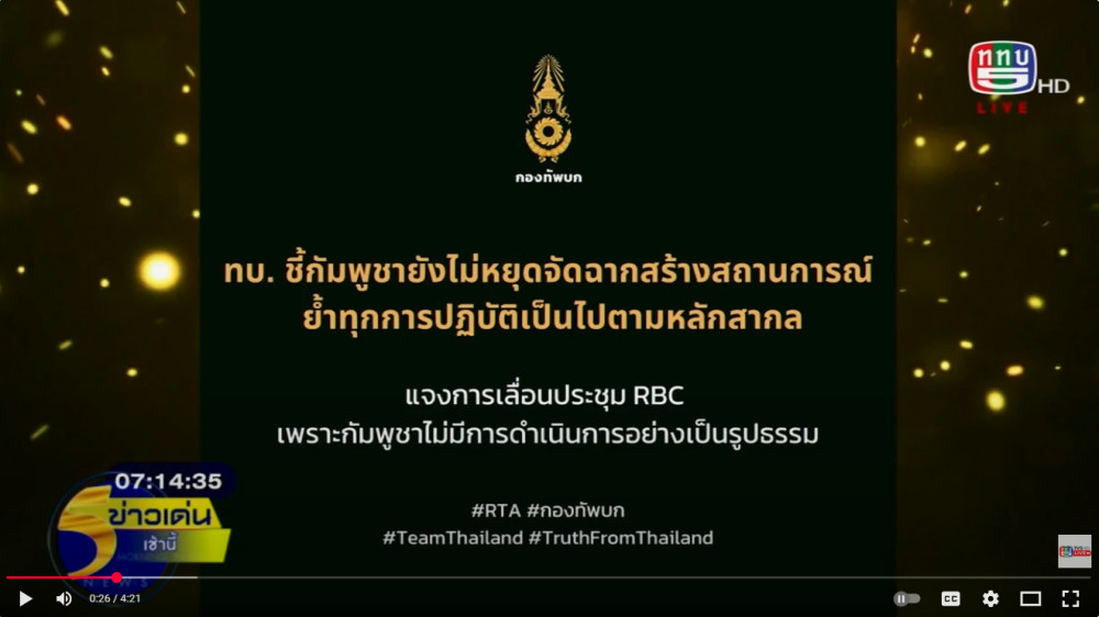 โฆษกกองทัพบก ชี้กัมพูชายังไม่หยุดจัดฉากสร้างสถานการณ์ ปลุกระดมม็อบจัดตั้ง ย้ําทุกการปฏิบัติเป็นไปตามหลักสากล และอยู่ในเขตพื้นที่อธิปไตยไทย แจงการเลื่อนการประชุม RBC เหตุเพราะฝ่ายกัมพูชาไม่มีความคืบหน้านําไปสู่การปฏิบัติใดๆ ให้เป็นรูปธรรม