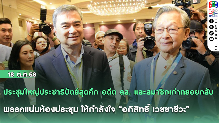 ประชุมใหญ่ประชาธิปัตย์สุดคึก อดีต สส. และสมาชิกเก่าทยอยกลับพรรคแน่นห้องประชุม ให้กําลังใจ “อภิสิทธิ์ เวชชาชีวะ” ว่าที่หัวหน้าพรรคคนใหม่ ด้าน “ชวน-ลูกชาย” ร่วมให้กําลังใจ ขณะ “เฉลิมชัย” ขออนุญาตลาประชุม