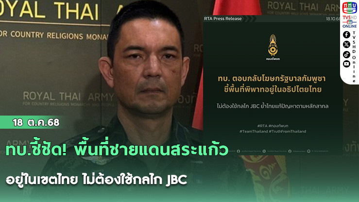 กองทัพบก ตอบโต้โฆษกรัฐบาลกัมพูชา ย้ําพื้นที่พิพาทอยู่ในอธิปไตยไทย ไม่จําเป็นต้องใช้กลไก JBC ชี้ไทยดําเนินการทุกอย่างตามหลักสากล