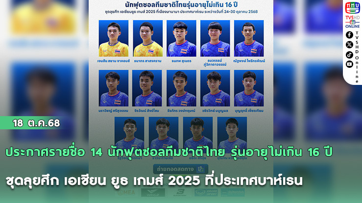ประกาศรายชื่อ 14 นักฟุตซอลทีมชาติไทย รุ่นอายุไม่เกิน 16 ปี ชุดลุยศึก เอเชียน ยูธ เกมส์ 2025 ที่ประเทศบาห์เรน