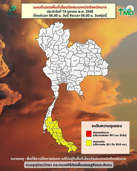 วันที่ 19 ตุลาคม 2568 - กรมอุตุนิยมวิทยา รายงานพยากรณ์อากาศประจําวันที่ 19 ตุลาคม 2568 คาดว่าในช่วง 24 ชั่วโมงข้างหน้า ประเทศไทยตอนบนยังคงมีฝนฟ้าคะนอง เกิดขึ้นได้ในหลายพื้นที่ ส่วน ภาคใต้ยังคงมีฝนตกหนักหลายจุด เนื่องจากอิทธิพลของลมตะวันออกและลมตะวันออกเฉียงใต้ที่พัดปกคลุมอ่าวไทย ประเทศไทย และทะเลอันดามันอย่างต่อเนื่อง โดยในช่วงนี้ ขอให้ประชาชนในภาคใต้ระวังอันตรายจากฝนตกหนัก ฝนที่ตกสะสม และน้ําท่วมขังในพื้นที่ลุ่มต่ํา รวมถึงควรเพิ่มความระมัดระวังในการเดินทางผ่านถนนที่มีน้ําท่วมขัง ขณะที่ชาวประมงและผู้ประกอบการเดินเรือควรเฝ้าระวังคลื่นลมแรง โดยเฉพาะบริเวณอ่าวไทยและทะเลอันดามัน ซึ่งมีคลื่นสูงราว 1 เมตร และบริเวณที่มีฝนฟ้าคะนองอาจสูงเกิน 2 เมตร