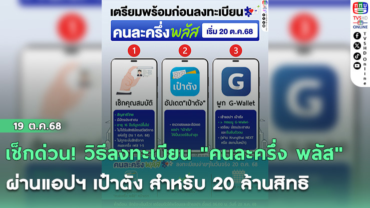 วันที่ 19 ตุลาคม 2568 - กระทรวงการคลัง ได้เปิด 3 ขั้นตอนสําคัญ เพื่อแนะนําประชาชนเตรียมความพร้อมก่อนการลงทะเบียนรับสิทธิโครงการ "คนละครึ่ง พลัส" จํานวนประมาณ 20 ล้านสิทธิ ที่จะเริ่มขึ้นในวันแรก วันจันทร์ที่ 20 ตุลาคม 2568 ตั้งแต่เวลา 06.00 น. เป็นต้นไป ผ่านแอปพลิเคชัน "เป๋าตัง" เท่านั้น