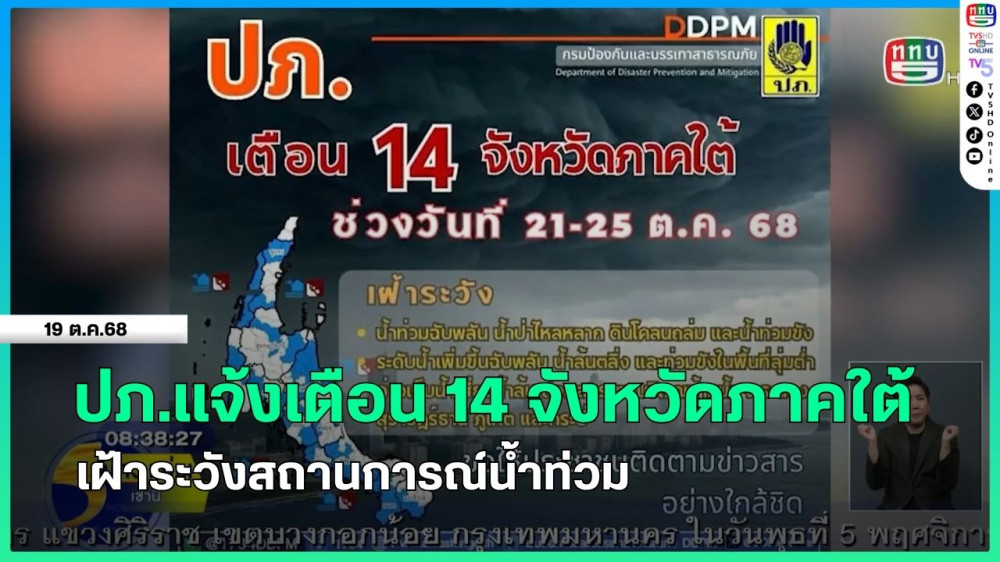 ปภ.แจ้งเตือน 14 จังหวัดภาคใต้ เฝ้าระวังสถานการณ์น้ําท่วม