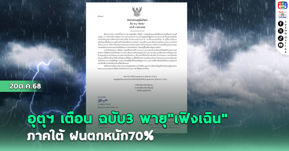 กรมอุตุฯ ประกาศฉบับที่ 3 เตือน!พายุโซนร้อนน"เฟิงเฉิน" ส่งผลให้ในช่วงวันที่ 23–24 ต.ค. 68 ภาคตะวันออกเฉียงเหนือมีฝนฟ้าคะนอง ส่วนภาคใต้มีฝนตกหนักถึงหนักมาก ระวังอันตราย จากน้ําท่วมฉับพลันและน้ําป่าไหลหลาก