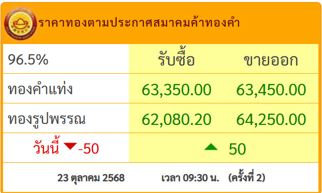 สมาคมค้าทองคําประกาศราคาทองคําประจําวันที่ 23 ตุลาคม 2568 เวลา 09.30 น.
