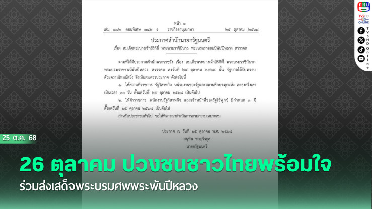 26 ตุลาคมนี้ ปวงชนชาวไทยทั่วประเทศเตรียมร่วมส่งเสด็จ “สมเด็จพระนางเจ้าสิริกิติ์ พระบรมราชินีนาถ พระบรมราชชนนีพันปีหลวง” จากโรงพยาบาลจุฬาลงกรณ์ สู่พระบรมมหาราชวัง ในพิธีเคลื่อนพระบรมศพอย่างสมพระเกียรติ