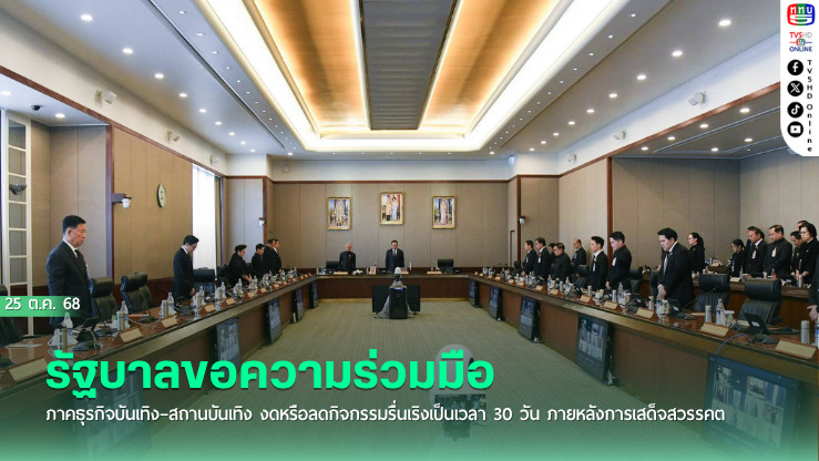 25 ตุลาคม 2568 ที่ทําเนียบรัฐบาล นางสาวลลิดา เพริศวิวัฒนา รองโฆษกรัฐบาล เปิดเผยว่า ภายหลังการเสด็จสวรรคตของสมเด็จพระนางเจ้าสิริกิติ์ พระบรมราชินีนาถ พระบรมราชชนนีพันปีหลวง รัฐบาลขอความร่วมมือจากภาคธุรกิจบันเทิง สถานบันเทิง และสถานบริการต่างๆ งดหรือลดกิจกรรมเพื่อความบันเทิงเป็นระยะเวลา 30 วัน เพื่อให้สอดคล้องกับช่วงเวลาแห่งความอาลัยของปวงชนชาวไทย