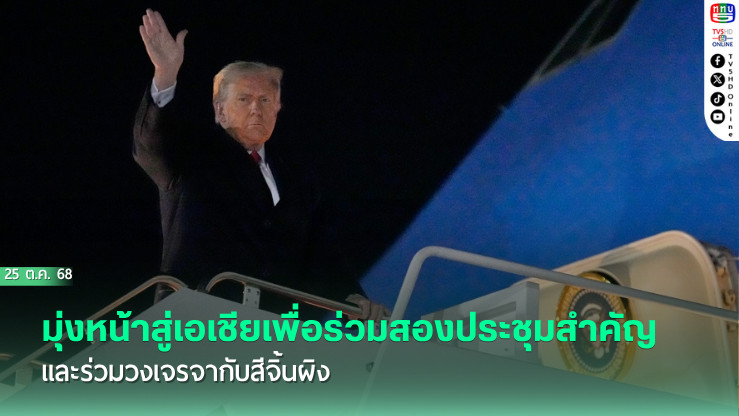 สํานักข่าวต่างประเทศรายงาน เมื่อวันเสาร์ที่ 25 ตุลาคม 2568 กล่าวว่า ประธานาธิบดีโดนัลด์ ทรัมป์ ของสหรัฐฯ เดินทางมุ่งหน้าสู่การเยือนเอเชียครั้งสําคัญที่มีทั้งการประชุมสุดยอดของภูมิภาคและโต๊ะเจรจาที่โลกจับตามอง กับประธานาธิบดีสีจิ้นผิงของจีน