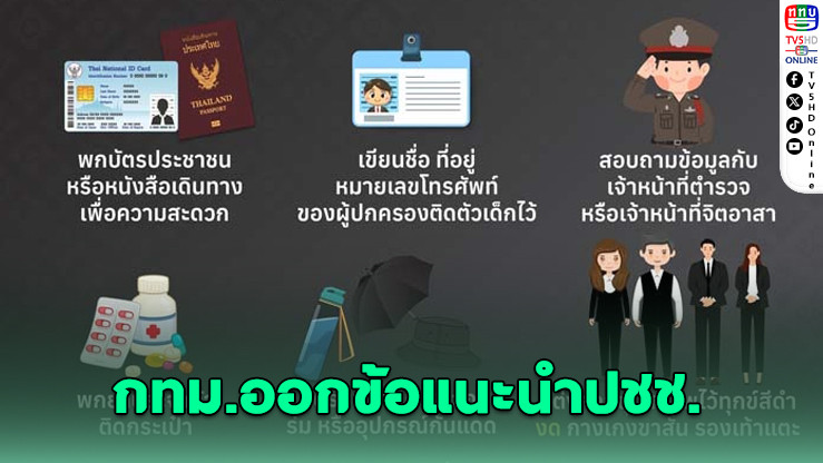 + เขียนชื่อ ที่อยู่ หมายเลขโทรศัพท์ ของผู้ปกครองติดตัวเด็กไว้