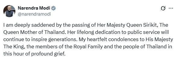 วานนี้ 26 ตุลาคม 2568 นายนเรนทรา โมดี นายกรัฐมนตรีอินเดีย ได้โพสต์ข้อความลงบนแพลตฟอร์มออนไลน์ X เมื่อวันที่ 26 ตุลาคม เพื่อแสดงความเสียใจต่อการสวรรคตของสมเด็จพระนางเจ้าสิริกิติ์ พระบรมราชินีนาถ พระบรมราชชนนีพันปีหลวง