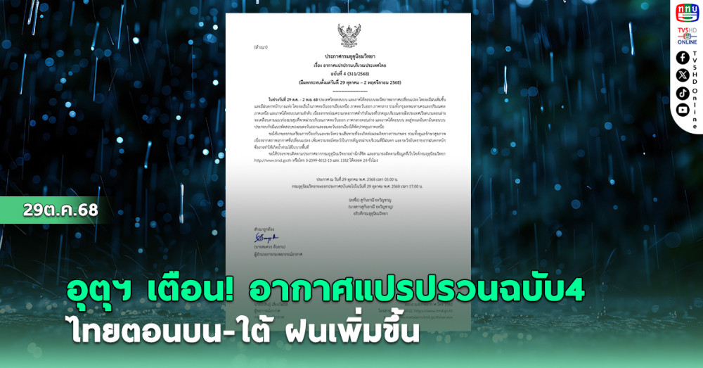 กรมอุตุนิยมวิทยา ประกาศเตือน เรื่อง อากาศแปรปรวนบริเวณประเทศไทย ฉบับที่ 4 (มีผลกระทบตั้งแต่วันที่ 29 ต.ค. - 2 พ.ย. 2568) ในช่วงวันที่ 29 ต.ค. - 2 พ.ย. 2568 ประเทศไทยตอนบน และภาคใต้ตอนบนจะมีสภาพอากาศเปลี่ยนแปลง โดยจะมีฝนเพิ่มขึ้น และมีฝนตกหนักบางแห่ง โดยจะเริ่มในภาคตะวันออกเฉียงเหนือ ภาคตะวันออก ภาคกลาง รวมทั้งกรุงเทพมหานครและปริมณฑล ภาคเหนือ และภาคใต้ตอนบนตามลําดับ เนื่องจากหย่อมความกดอากาศต่ํากําลังแรงที่ปกคลุมบริเวณชายฝั่งประเทศเวียดนามตอนล่างจะเคลื่อนตามแนวร่องมรสุมที่พาดผ่านบริเวณภาคตะวันออก ภาคกลางตอนล่าง และภาคใต้ตอนบน ลงสู่ทะเลอันดามันตอนบน ประกอบกับมีแนวพัดสอบของลมตะวันออกและลมตะวันออกเฉียงใต้พัดปกคลุมภาคเหนือ